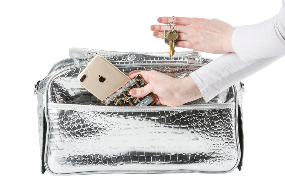 Marlee Silver Gator - Brand new from Petote! Our best selling Marlee Bag gets a chic update in stylish silver alligator pattern faux leather. The Marlee Bag is sure to be your favorite dog bag for sneaking your dog in stores and restaurants, toting your dog around town, or taking your dog on an airplane. Leave your purse behing--the Marlee Bag is loaded with pockets. Two front pockets and one back side zip pocket are perfect for storing all of your belongings. You will want to carry your dog everywhere in the Marlee Bag!