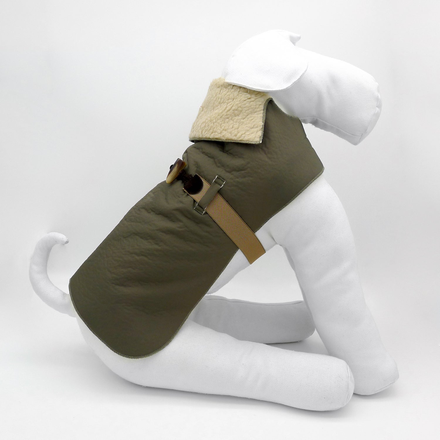Reversible dog overcoat made of paired sharp-cut fabric: ivory color artificial fur on one side and water-repellent military green technical fabric on the other. That's why this article is suitable both for the rigid temperatures and the rainy seasons. The elastic belt is enriched with a toggle button. A real handy and comfortable article of dog clothing that links functionality and personality. Two articles of clothing in one!