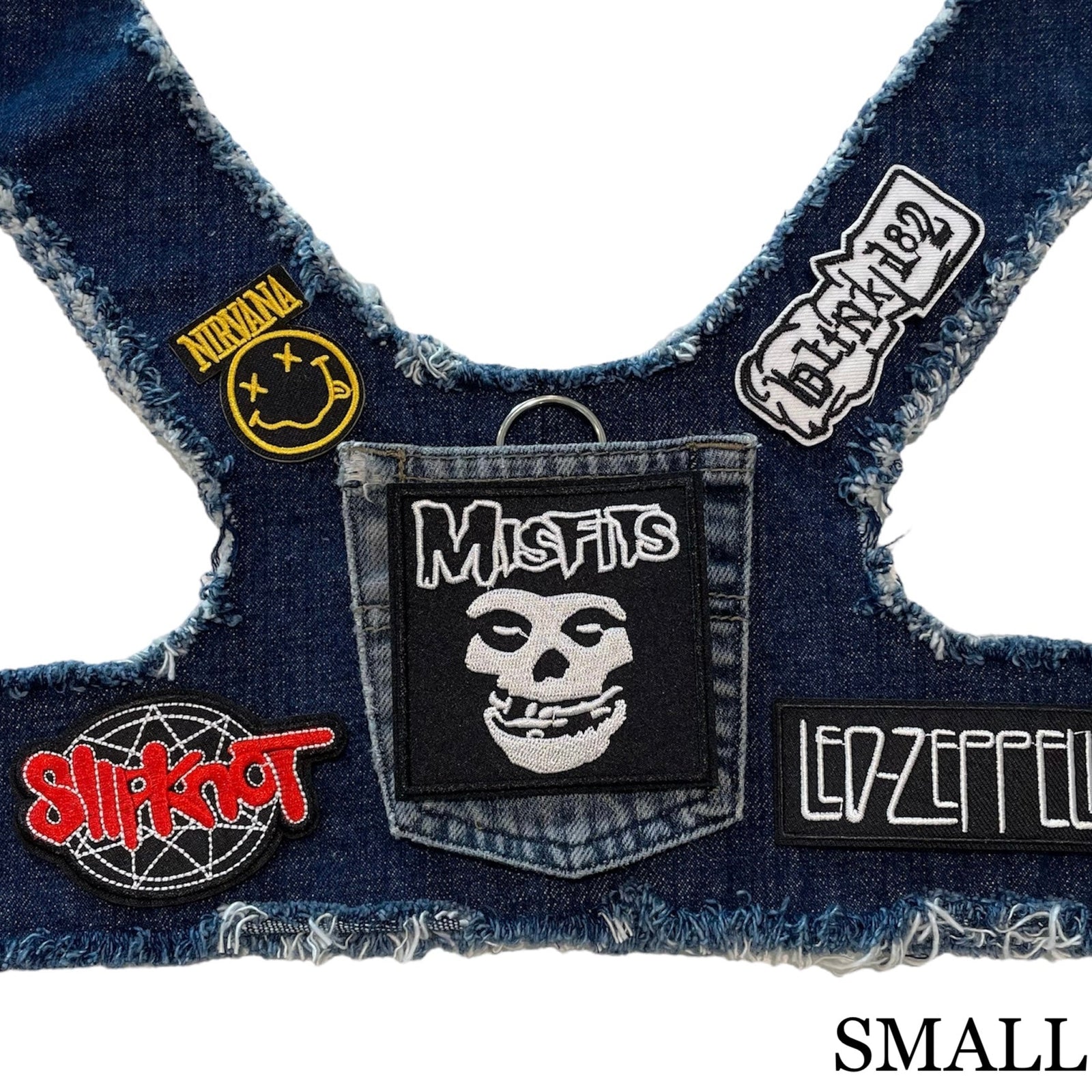 Revamp your look with this bold Denim Harness featuring the iconic "Misfits" patch. "Misfits" patch will vary based on size (pictured). Secondary patches may vary unless you message with specific requests. Available in rich blue or black denim. We repurpose denim for D-ring leash attachment and the pocket to keep your pup rockin'! Under your pup's chest, this harness secures with nylon hook and loop fastening. Ready to transform your accessory game? Personalization is now available! Example is pictured second to last. Shades of denim may vary. Please check the size chart in the last photo especially if personalizing as items with personalization are not able to be returned or exchanged.
