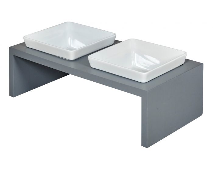 The dark grey finish of the Moderno Feeder, contrasted with the bright white ceramic bowls, adds a striking touch of modern sophistication. The stand is made from sustainable solid wood with a painted cabinetry finish. This sturdy stand is made to withstand daily use and is easily wiped clean, making this a long-lasting addition to your home. The elevated feature of these feeders promotes better digestion and posture by reducing strain on their neck and joints, while the solid construction keeps the bowls in place preventing spills and messes. The white bowls are made from high-quality dishwasher-safe, lead-free ceramic, providing a hygienic and durable feeding solution for your pet’s meals.