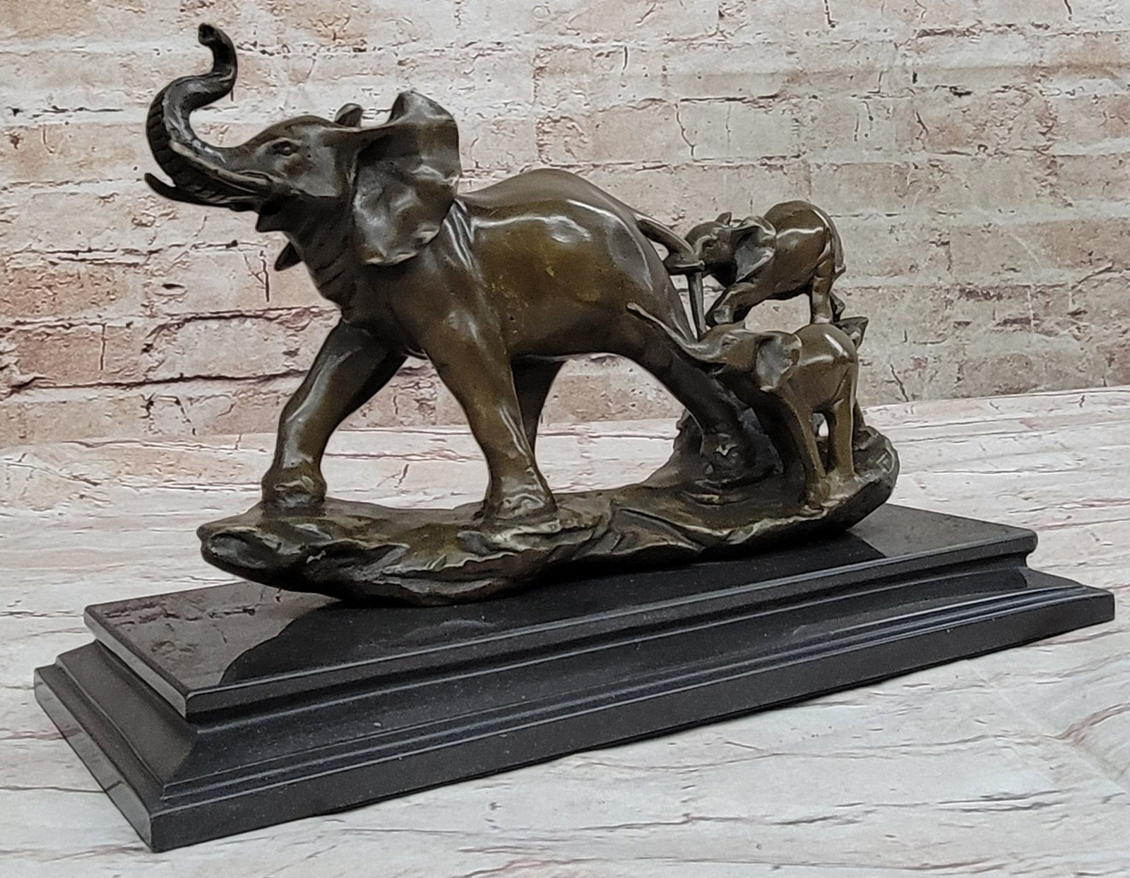 Experience the tender bond of a mother's love with this extraordinary bronze sculpture titled "Mother Affection." This captivating artwork captures the essence of familial connection and showcases the beauty and strength of these majestic creatures. The intricate details bring the scene to life, depicting a female elephant gracefully standing tall and protective, while her two adorable babies playfully explore their surroundings. The artist's signature, Williams, serves as a testament to the authenticity and artistic mastery of this remarkable piece. Crafted with meticulous precision using the timeless technique of bronze sculpting, this sculpture emanates a sense of elegance and sophistication. The lustrous bronze finish adds depth and richness to every carefully sculpted curve and contour. Whether displayed in your home, office, or outdoor space, this statue is certain to captivate hearts and inspire admiration. Celebrate the beauty of nature and the unbreakable bond between a mother and her young with this exquisite bronze masterpiece.
