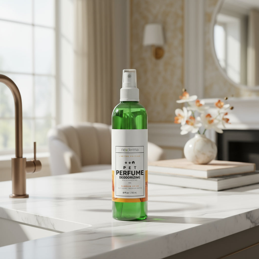- Nexderma Deodorizing Pet Perfume is ideal for sensitive skin dogs Formulated with Colloidal Nano-particles of Silver Natural ingredients provide aid in the relief of itching, pain, and inflammation Provides antifungal, and antimicrobial properties, rich in Omega 3 fatty acids helps to keep dogs shiny and moisturized Prevents dandruff and soothes hair follicles resulting in less shedding Alcohol-Free Pleasant Long Lasting Scent PH-balanced, Free from parabens and chemical dyes 8oz, With Pumpkin Spice scent Directions to use: Spray Directly onto dogs after bathing, between bathing or at the source of an odor