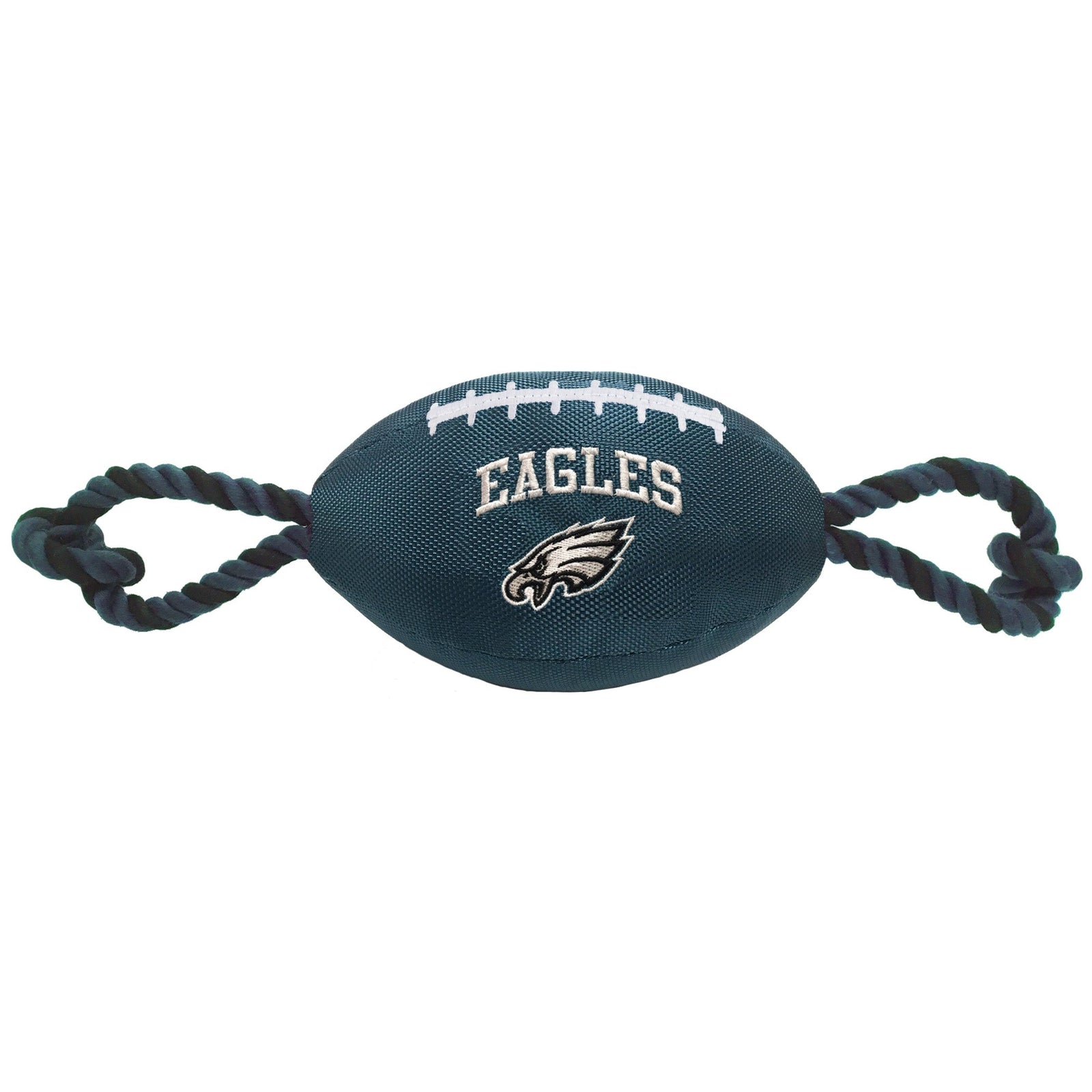 Plush football toy has an embroidered NFL team logo on the front, and the team logo on the back. The squeaker and contrast tug rope make it great fun for you and your pet!