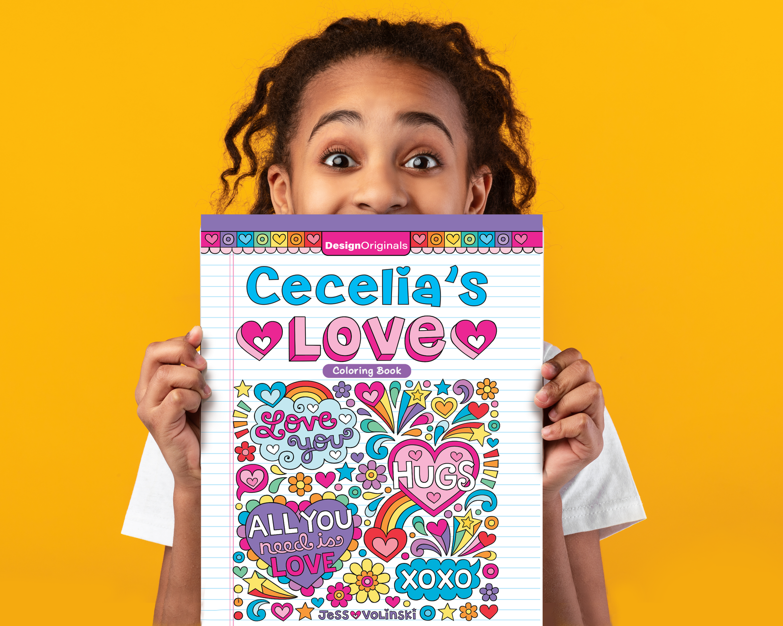 Welcome to a world of love and hugs with Notebook Doodles® Love! This custom coloring book makes for a perfect personalized gift for someone special! Make it unique by filling out the form on this webpage to add the recipient’s name to the front cover, as well as a small message from you that will be printed on inside front cover dedication page. Featuring over 20 heartfelt designs of sweet sentiments, X’s and O’s, and more to color with markers, gel pens, watercolors, or colored pencils, kids will love expressing their love and creativity with this adorable coloring book for tweens. Illustrated by best-selling coloring book artist, Jess Volinski.
