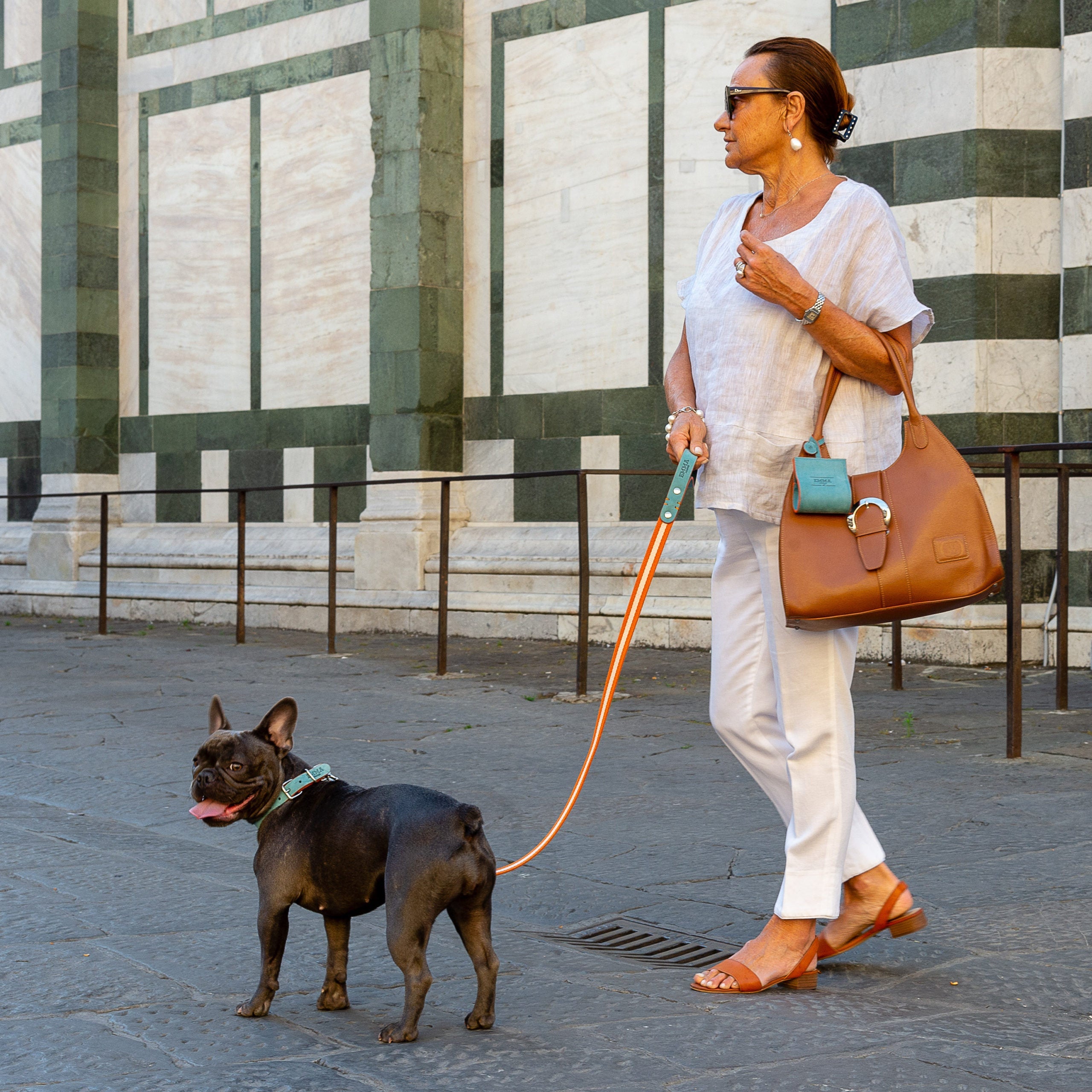 Made of precious raw-cut nubuck, with contrasting handmade seams and rim. Nubuck is a luxury material, which combines a softness comparable to silk with a strong resistance, also given by the full thickness. Its characteristic elasticity also reduces the tugs at the dog\u2019s neck, becoming a charming accessory for the person and for the four-legged friend.