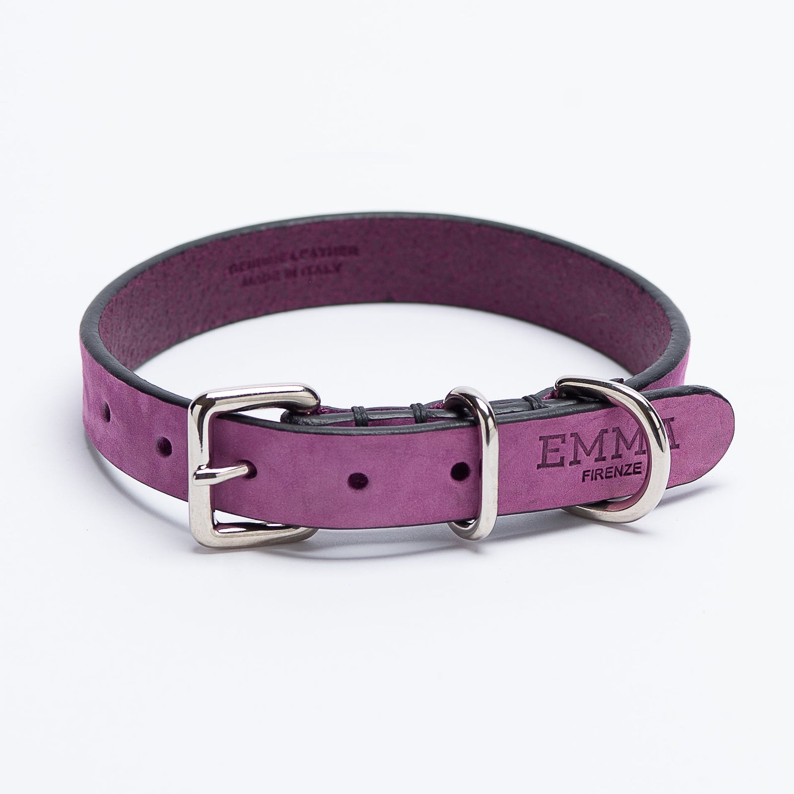 We imagined these designer dog collars as they were jewels. Nubuck Fuchsia-Collar, leather collar evocative of the nuances of the Vignola\u2019s cherries, celebrating the absolute quality tradition of Made in Italy. Elegant and handmade: these leather dog collars signed by the prestigious EMMA Firenze\u2019s lettering become more precious when worn by a French Bulldog or a Dachshund, they give a refined look to Boxers, Jack Russels and Rottweilers, they make the natural qualities of Labradors and Greyhounds stand out.