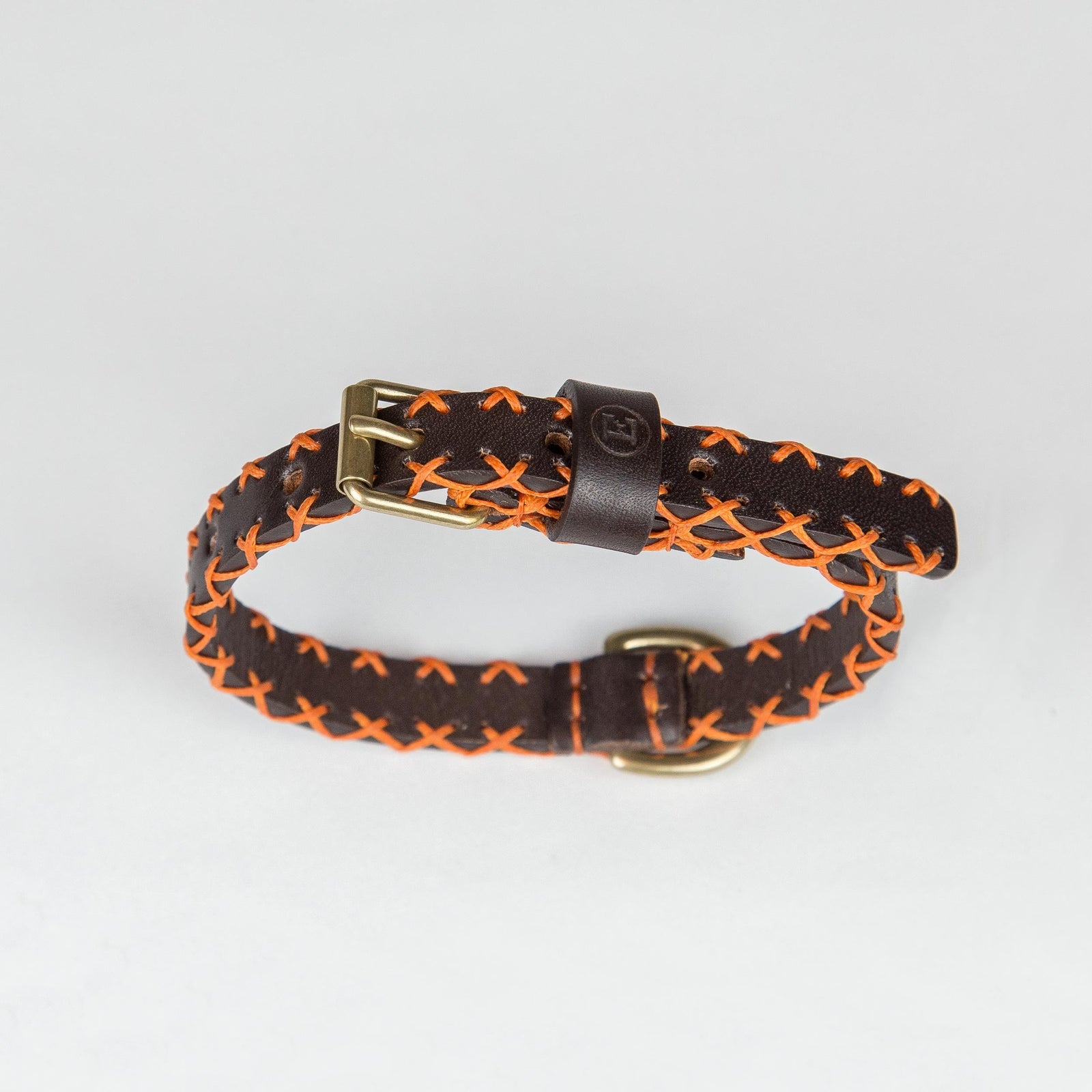 Dark brown, sharp cut, oil-finished cowhide collar, with waxed cotton orange stitching and silver plated brass accessories. Every single product is entirely handmade by skilled Florentine leather makers, from the cutting to the strong seams and waxed string threading that gives a unique character.