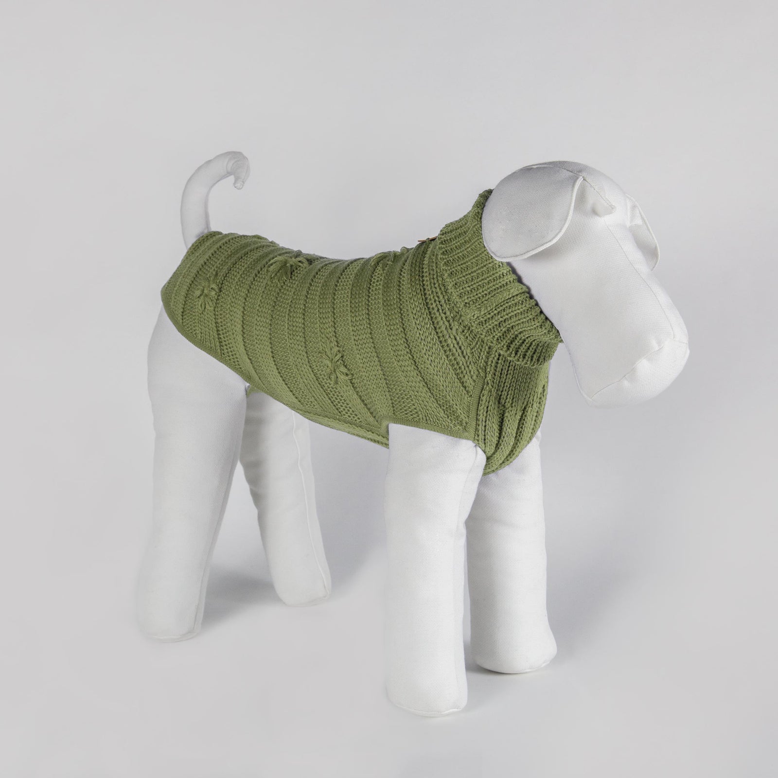 Pistachio color plain and purl stitch pure virgin Merino Superwash wool knitted dog coat with handmade floral embroideries . A warm and light garment to protect your four-legged friends on the cold days. Merino sheep fleece is highly valued and produces an extremely fine and precious wool, with a longer lifespan if we compare it with a standard wool obtained from a common sheep. The handy and comfortable fit of this sweater for dogs makes it perfect for your dog's protection.