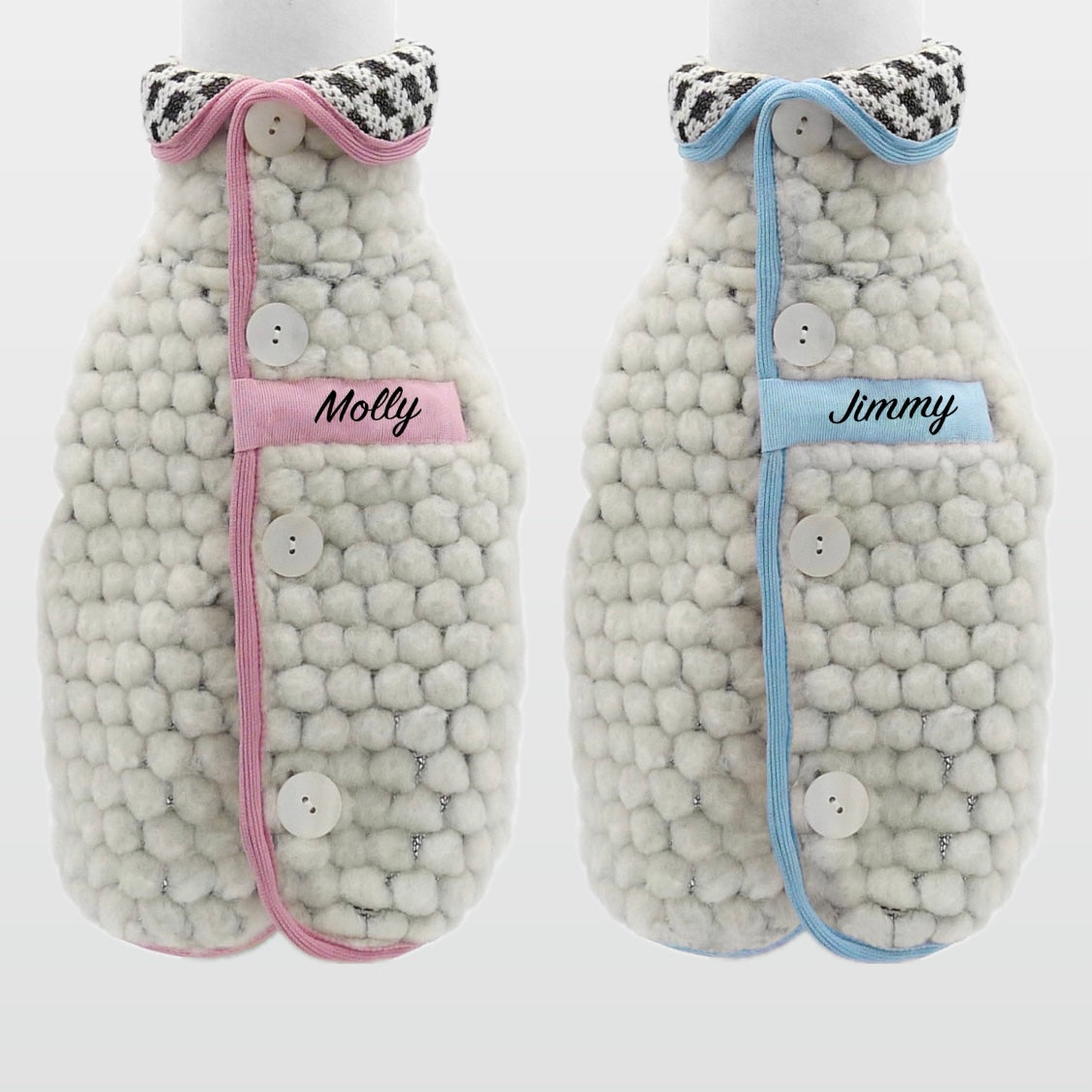 Dog sweater made to measure in pure white pure wool, worked in ‘pearl’ stitch and edged optionally of flamingo pink or sky blue knit, with real natural mother-of-pearl buttons.