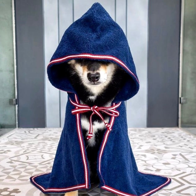 PRESIDENTIAL BATHROBE, more than a dog bathrobe, a fashion robe of absolute charm in the wardrobe of your pet. An accessory dedicated to animals living together with men and women enjoying an impeccable style, a dog bathrobe designed for those lovers of details.