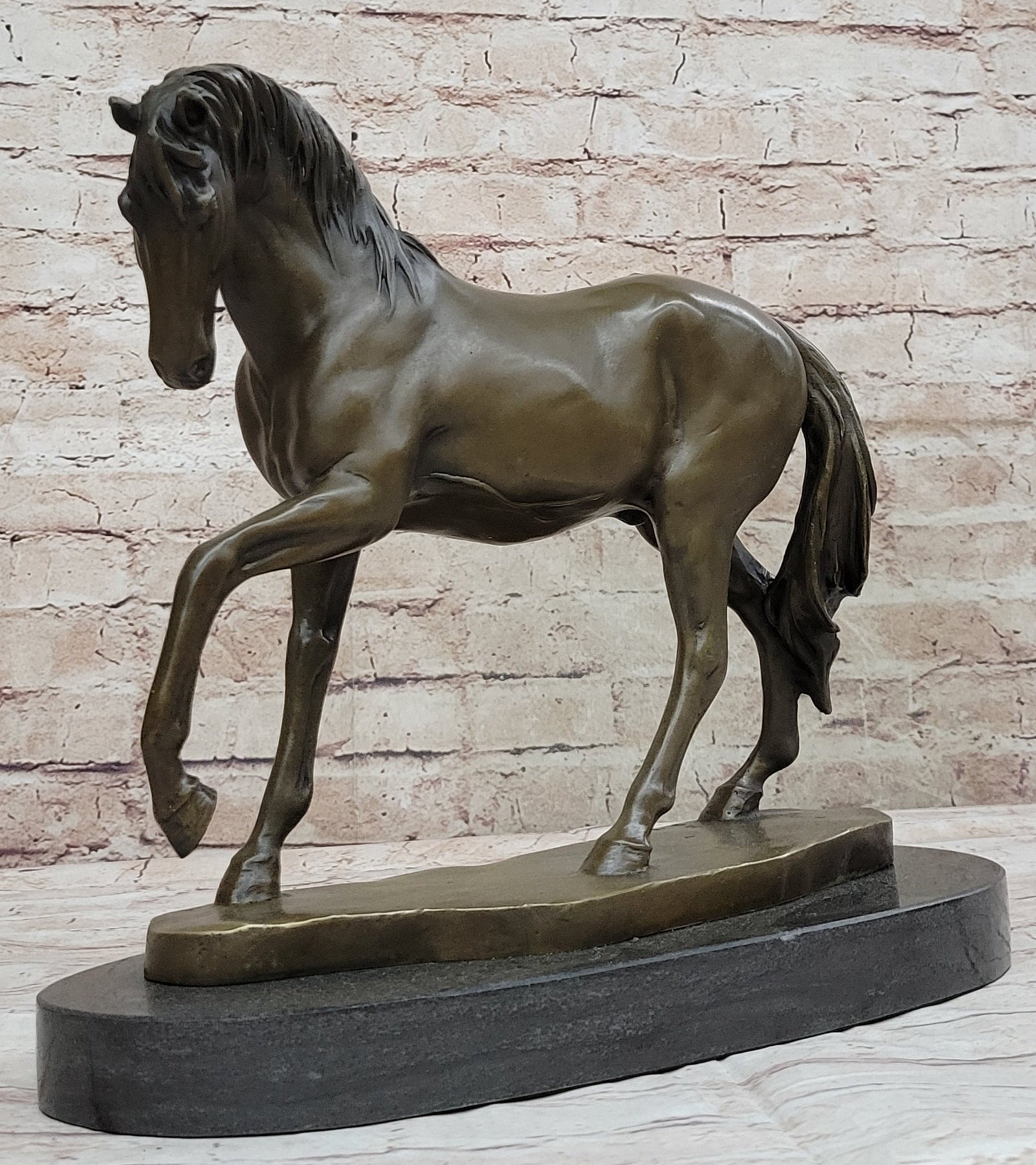 Immerse yourself in the beauty of nature with this captivating bronze sculpture, depicting a magnificent mare gracefully navigating through lush green fields under the warmth of the spring sun. Crafted with meticulous attention to detail, the sculpture perfectly captures the mare's robust physique and flowing mane, evoking a sense of tranquility and grace.