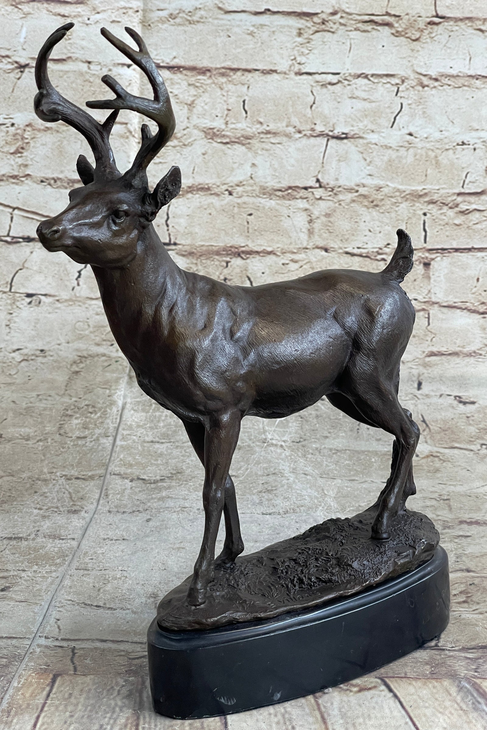 Crafted with meticulous precision using the age-old lost-wax casting technique, this bronze sculpture is a testament to enduring quality and artistry. The rich brown patina finish enhances its visual appeal, ensuring its preservation for generations. Elegantly mounted on a black oval marble base, the sculpture is further distinguished by the signature of the esteemed artist E. Villanis, affirming its quality and artistic value. Whether displayed as a centerpiece in a home or given as a distinguished gift, this sculpture is certain to evoke admiration and appreciation for its beauty and profound symbolism.