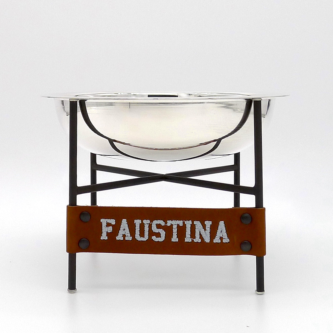 Each bowl can be, on request but at no additional cost, personalized with a cognac-colored leather band on which your dog's name will be embroidered in silver, inserted in the holder.