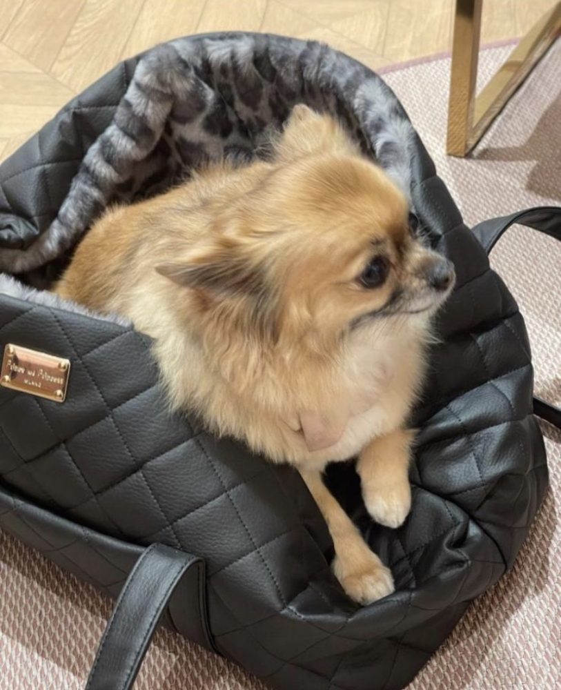 Our newest luxury dog bag design! This soft bed bag carrier comes with a removable mini blanket and safety hook for your pup. This luxurious quilted faux leather and faux fur bag is the perfect way to carry your little prince or princess around town.