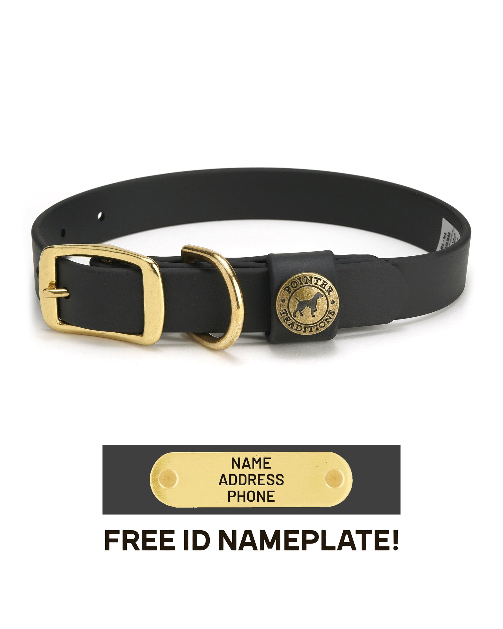 All collars come with a FREE custom brass ID nameplate! All nameplates are secured to the collar with solid brass rivets.