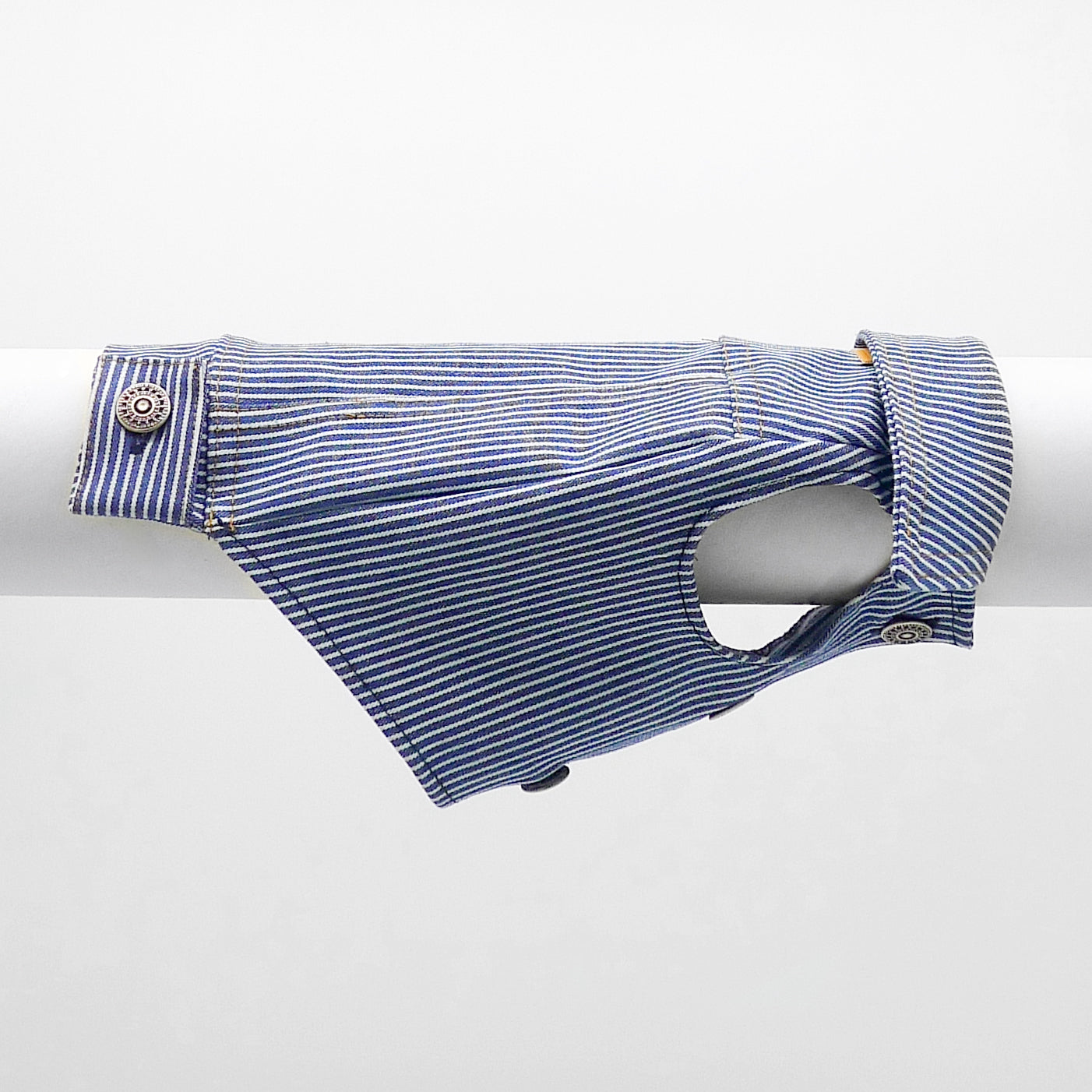 Bespoke dog jacket in classic, sporty indigo blue and white striped cotton denim, with a design that respects the original version, from seams to the original metal buttons. A garment born in 1880, when Mr. Strauss designed the first denim jacket, and that could not be missing in the collections of Emma Firenze.