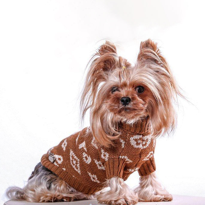 An extremely fashionable teacup dog turtleneck with a jacquard pattern representing Prince and Princess’ revisited logo.