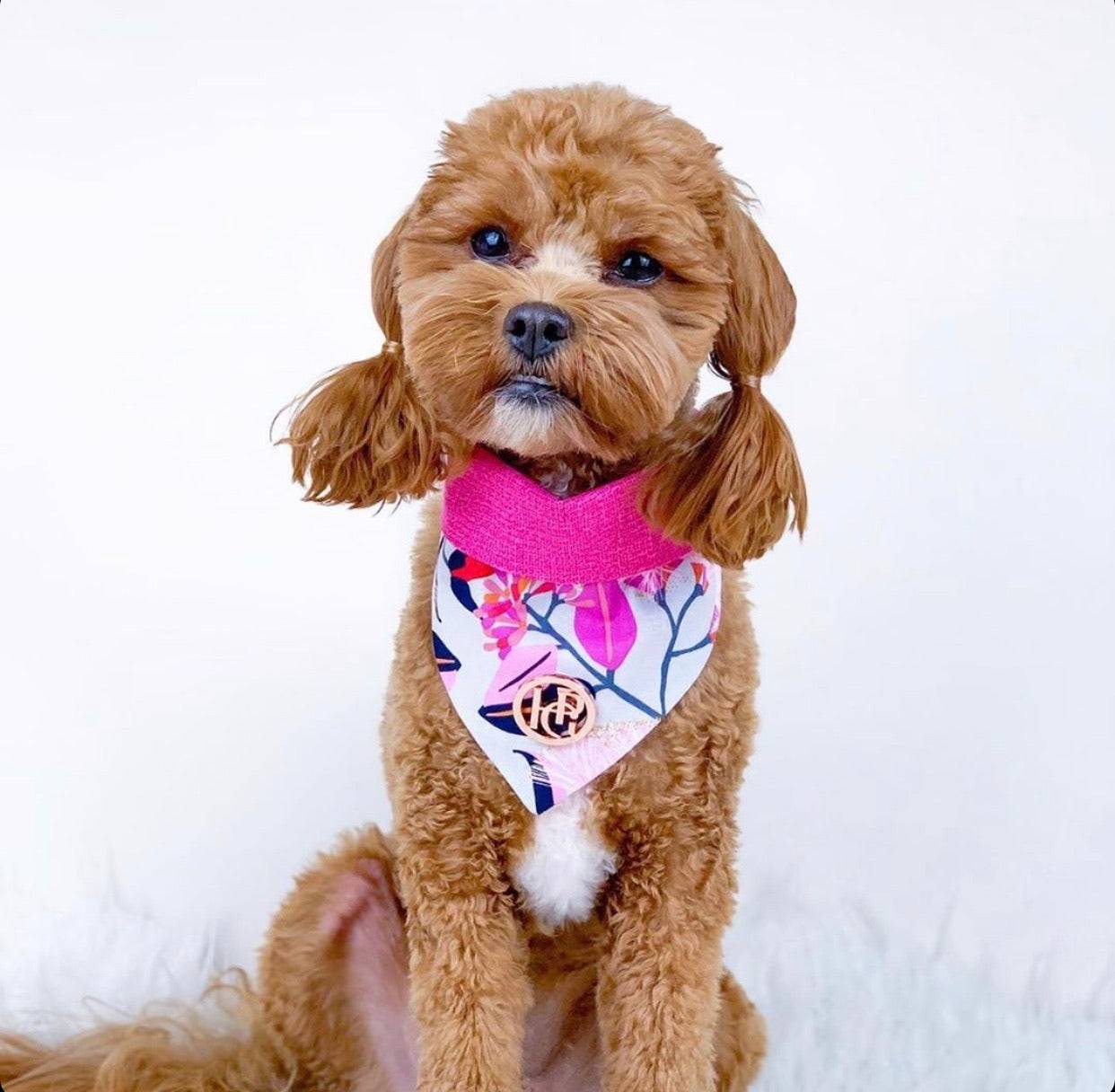 Our scarf fabrics are unique prints that are sourced in exclusive fabric houses and are of the highest quality. Our scarves are hand made here in Australia. HGP' Collection of Scarves are made from 100% cotton and 100% linen/linen blends. Our fabrics are durable, comfortable and stylish suitable for any fashion conscious pup. Each scarf comes with a press stud to match the colour of the scarf along with a stylish HGP emblem made from zinc alloy hardware.