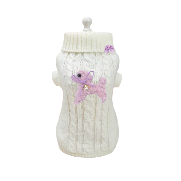 Exude timeless French sophistication with The Parisian Poodle Cable Knit by Bark Fifth Avenue. This exquisite ivory sweater is crafted from ultra-soft cable knit fabric, designed for comfort and refined style. Each piece features a hand-stitched textured poodle appliqueavailable in blush or chestnutadorned with a lavender satin bow and a crystal charm for a touch of sparkle. A petite lavender bow at the neckline completes the look with classic elegance.