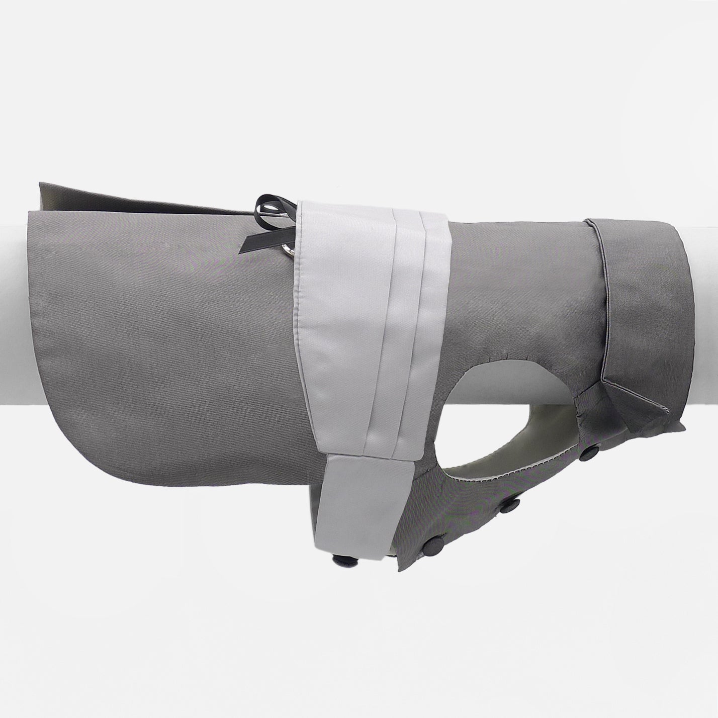 Classic tailored dog evening jacket in fine silk shantung satin in anthracite gray, lined in pearl gray silk and with inverted pleat. The silk used is produced in Como and is considered one of the best in the world. Two satin ribbons of the same color are inserted into the pleated cummerbund in pearl gray silk or in the same color as the suit, which will be used to position the wedding rings. The tuxedo collar completes the most famous and classic formal jacket. The internal lacing is done with buttons also covered in the same fabric. A reinterpretation of the Tuxedo for this elegant and chic garment that will make your puppy participate in the most important day of your life, with the style that distinguishes every garment of our Maison. Also suitable for any other type of ceremony, especially in the evening.