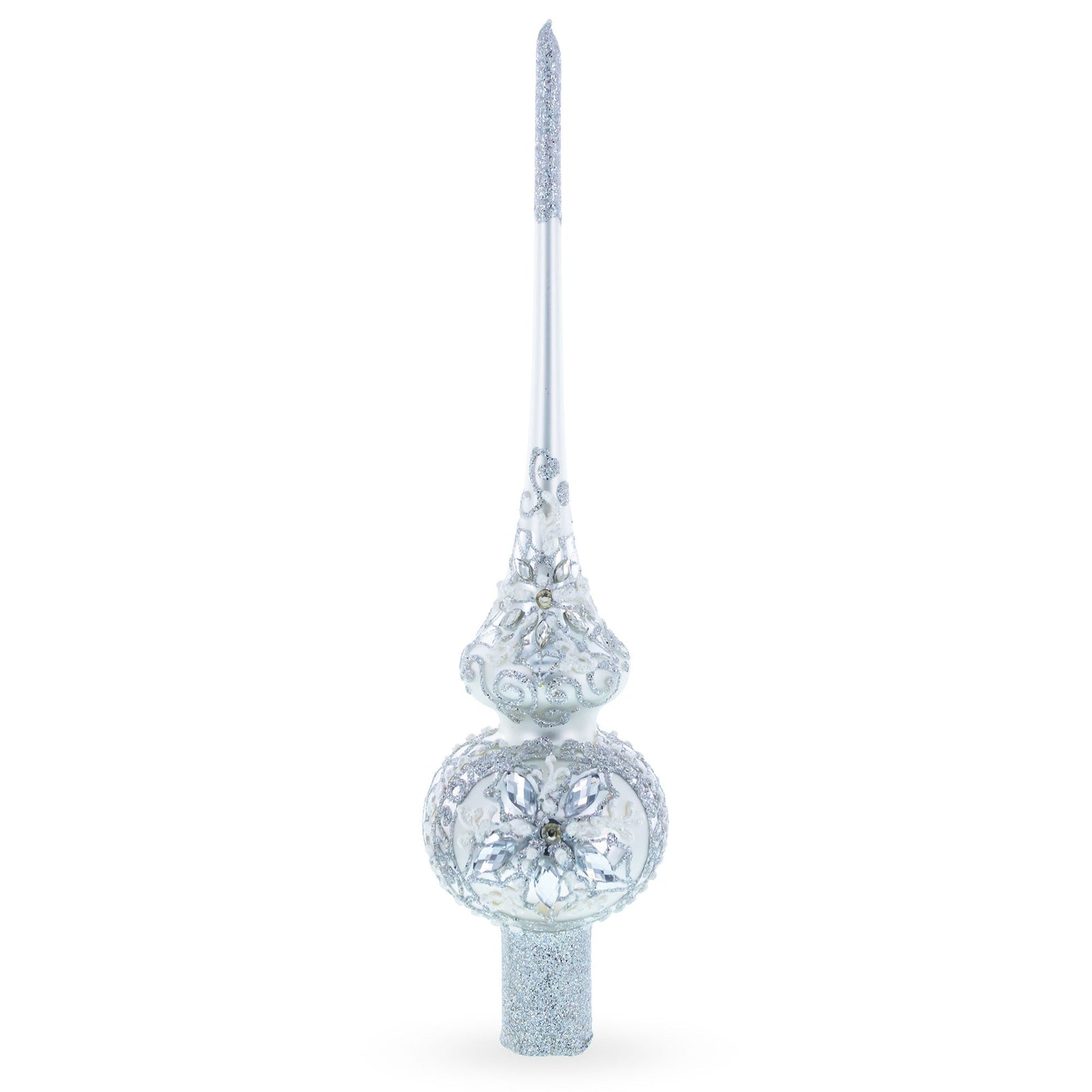 White Jewels Star on Glossy Silver Glass Christmas Tree Topper 11 Inches